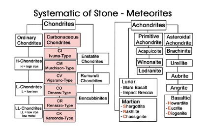 There are many types of meteorites, from stone meteorites (chondrites and achondrites), iron meteorites, stony-iron meteorites, to planetary meteorites. All of these types are typically subdivided into corresponding subtypes. You can see a short classification scheme of stony meteorites below.